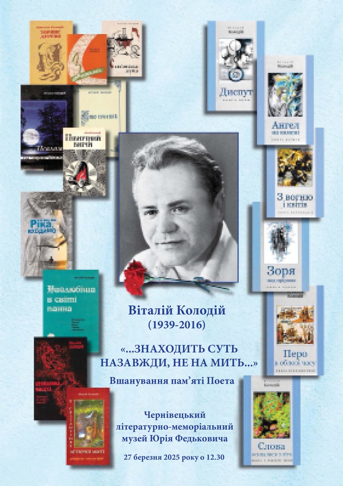 Друзі, 27 березня 2025 року о 12.30 у Чернівецькому літературно-меморіальному музеї Юрія Федьковича вшановуємо пам’ять Віталія Дем’яновича Колодія, відомого українського поета, прозаїка, драматурга, перекладача, автора численних видань, члена Спілки письменників України.